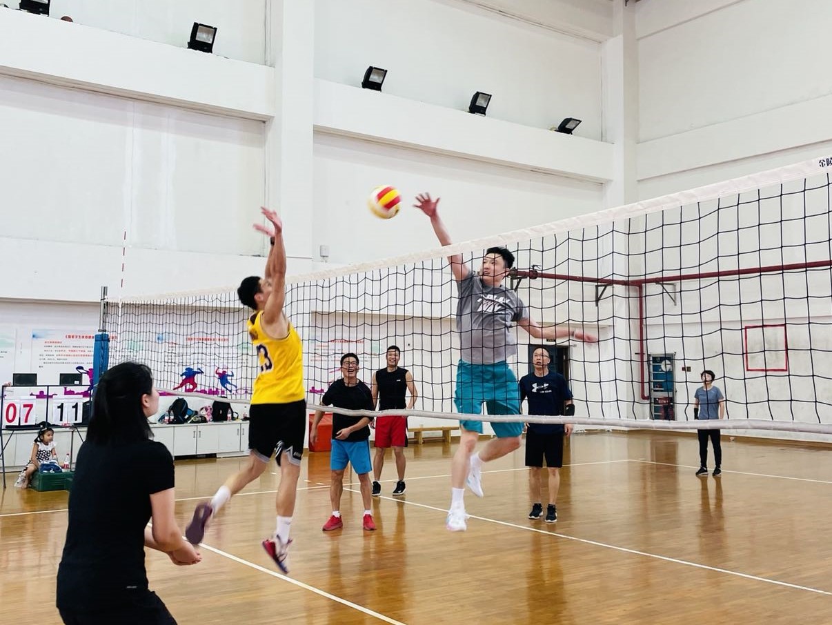 比赛分为A、B、C、D四支队伍,两两角逐。赛场上,队员们个个精神饱满,热情高涨,全力投入到比赛中。赛场外,啦啦队员的加油呐喊声此起彼伏。一个个精彩的扣球、拦网,将体育科学部教职工那股拼劲展现的淋漓尽致。经过一番激烈的角逐,最终由以王永华老师为队长的D队夺得冠军。