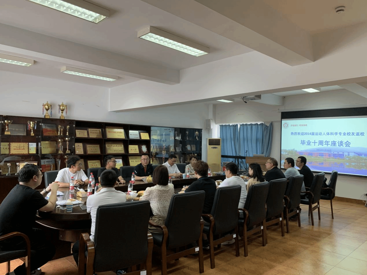 十年回首,情系温医。5月25日中午,体育科学部2014届运动人体科学专业校友值毕业十周年之际,重返母校,欢聚一堂,共叙情谊。体育科学部热烈欢迎校友回家,在体育馆4楼会议室,为他们举行欢迎仪式并开展座谈会。原体育科学学院党总支书记李旭东老师和部分教师代表参加座谈会。体育科学部主任刘海平主持会议并讲话。