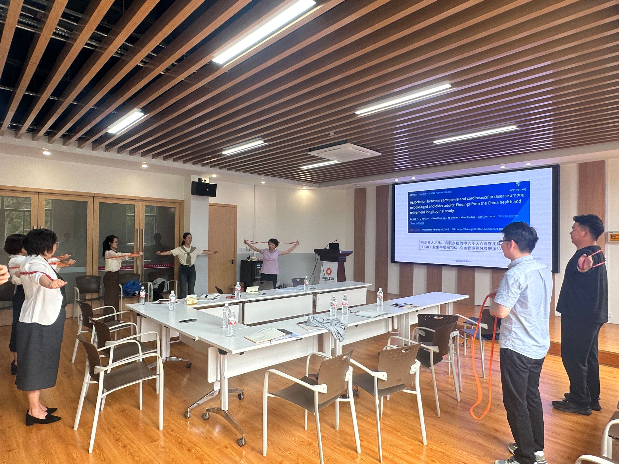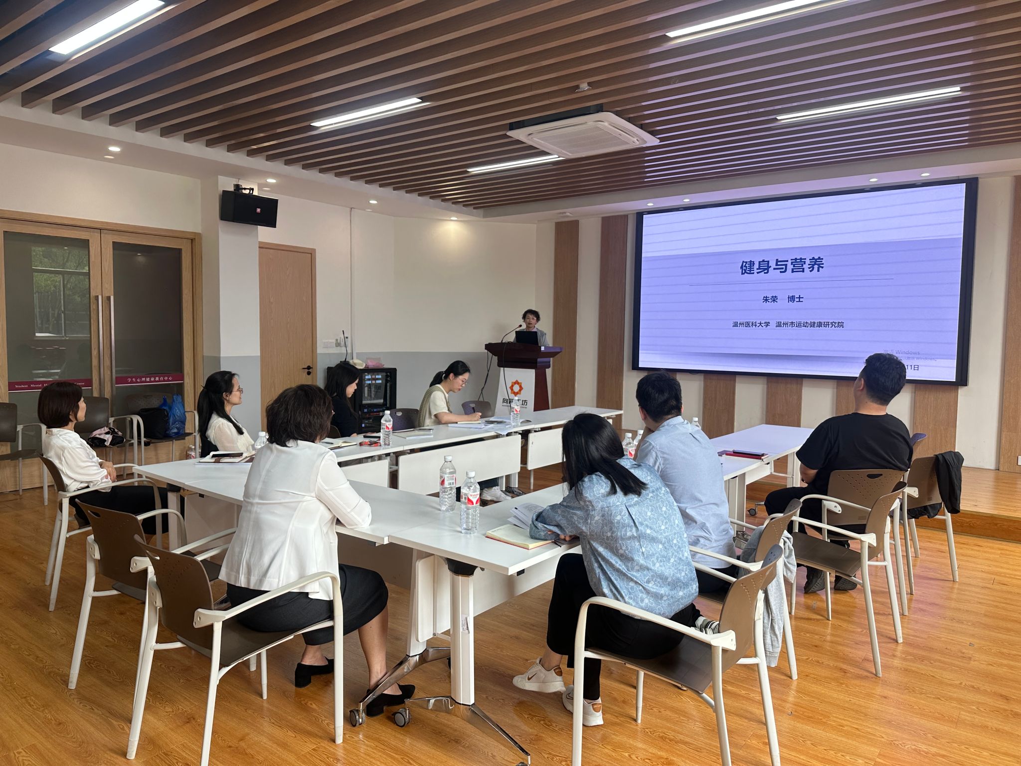 朱荣全面讲解了健康营养知识和科学锻炼的方法。她首先讲解日常健身的主要内容,即心肺耐力、肌肉力量和身体柔软三部分,建议常坐办公室的党员们要根据自身情况,合理选择锻炼方式、时间、频率,并注意预防运动损伤发生。关于膳食,朱荣建议要注意营养均衡。参考2023年温州市居民膳食结构调查结果,建议党员们“减油增豆加奶”,“吃动平衡,健康体重”,鼓励大家拥有规律运动与合理营养的健康生活方式。讲座中,朱荣还示范了适合办公室的弹力绳运动。