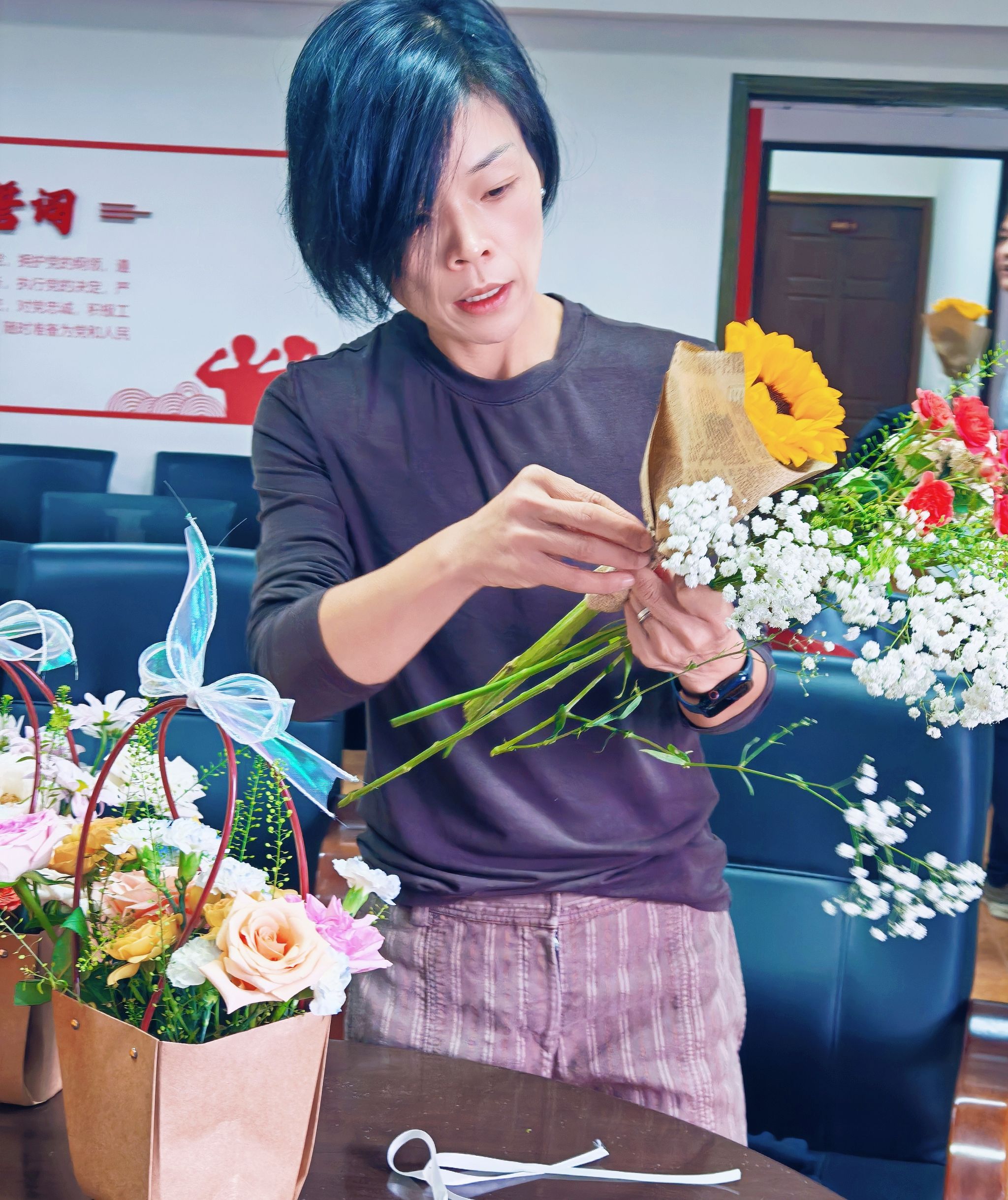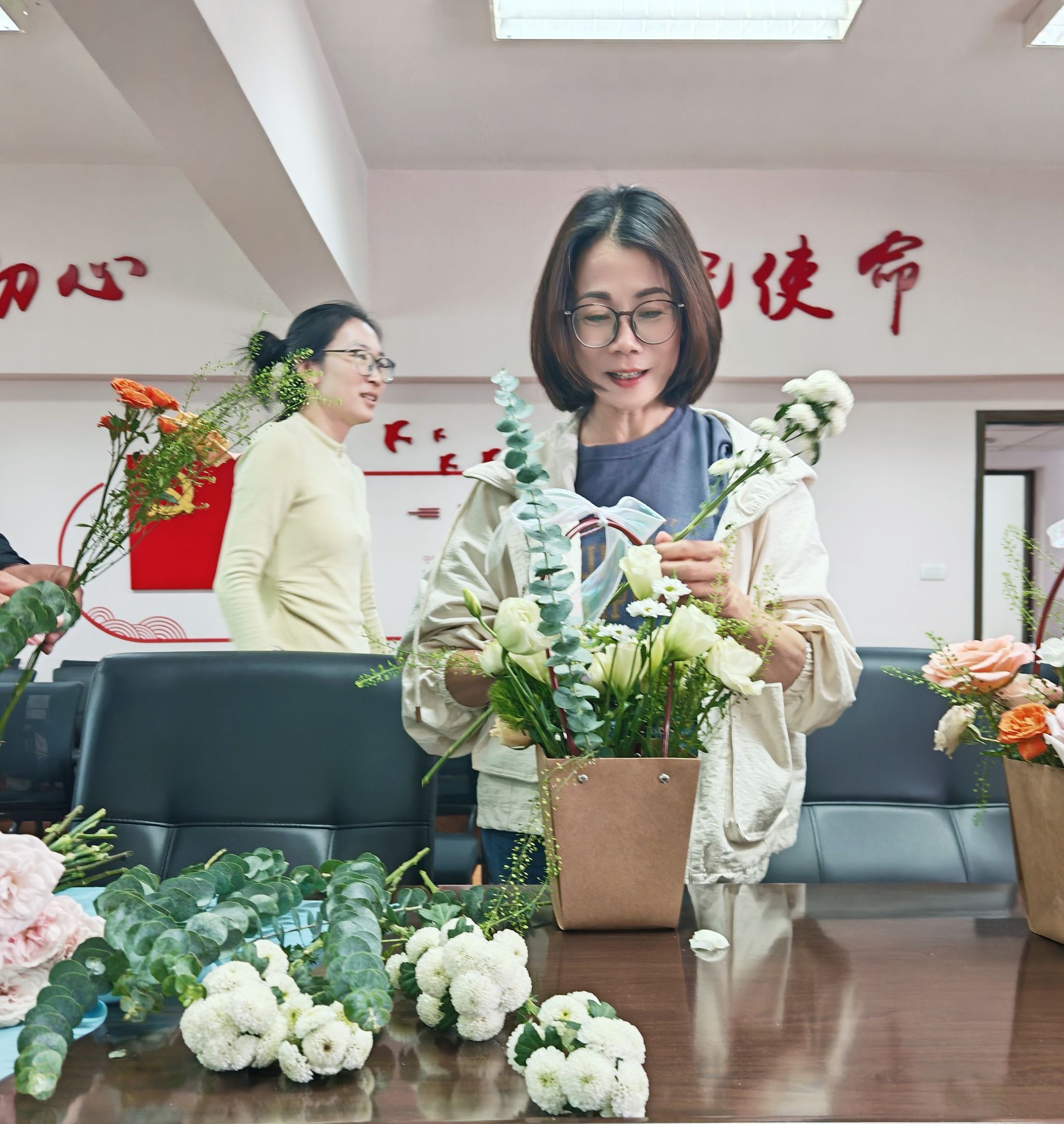 活动现场,鲜花争艳、香气四溢。学部妇联早早备好玫瑰、康乃馨、洋桔梗、尤加利等各色花材与工具,女教职工们纷纷化身“花艺师”,根据自己的喜好从花材选择、色彩搭配、剪枝技巧到造型设计,结合自己的审美与想象,修剪枝叶、搭配色彩、错落摆放。时而低头沉思布局,时而相互交流技巧,现场氛围轻松愉悦、温情满满。原本零散的花材,在大家的巧手下,逐渐变成一束束错落有致、独具匠心的花艺作品。看着自己亲手完成的作品,每个人脸上都洋溢着幸福的笑容,纷纷拍照留念,定格这份美好时光。
