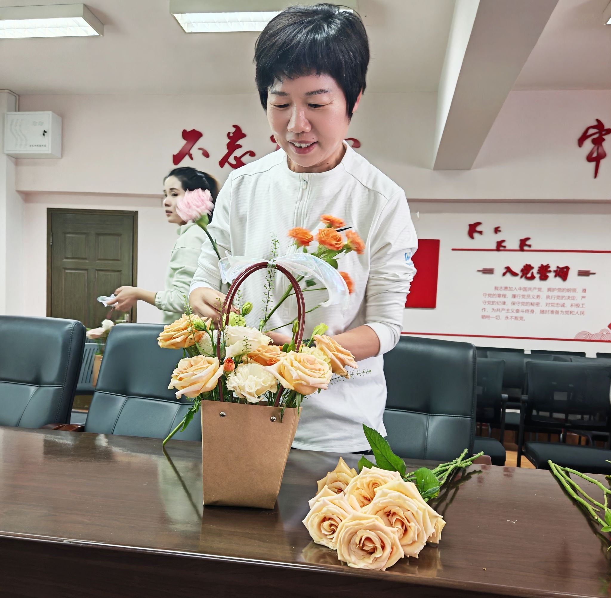• 为丰富女教职工精神文化生活,舒缓工作压力,凝聚团队力量,以饱满热情迎接即将到来的校运动会,近日,体育科学部党委、工会、妇联精心组织“拾花拾趣拾温情、聚心聚力迎赛事”女教职工插花体验活动,部门全体女教职工齐聚一堂,共赴一场与鲜花的浪漫之约。部门主任刘海平、书记陈素云、工会主席王守都和青年男教师代表受邀一起参加了本次活动。