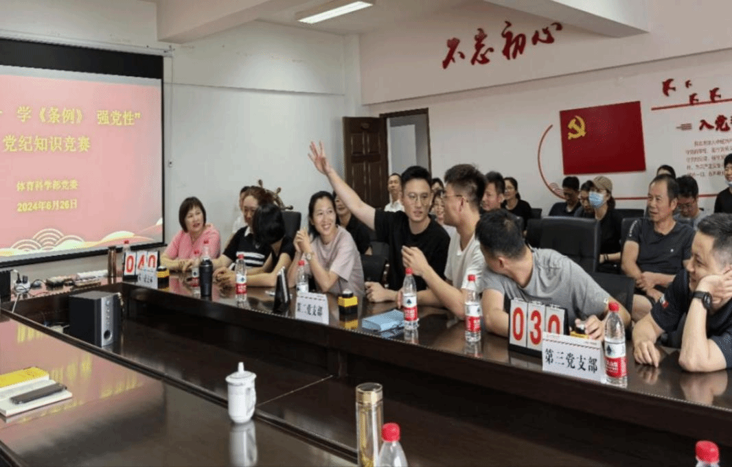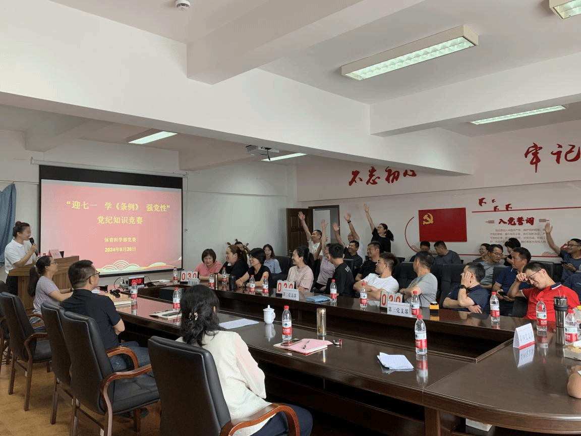 为深入学习贯彻习近平总书记关于党纪学习教育的重要讲话和重要指示精神,庆祝建党103周年, 6月26日上午,体育科学部党委开展“迎七一 学《条例》 强党性”党纪知识竞赛活动。校党委委员、副校长朱雪波出席活动并讲话。体育科学部党委书记陈素云主持会议,体育科学部主任刘海平、组织员赵建中和全体党员、教师参加活动。